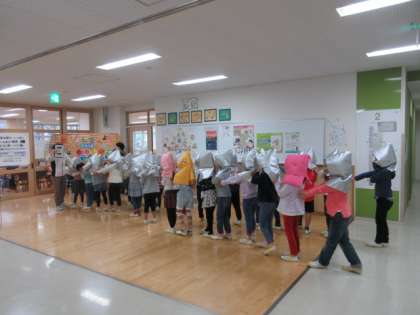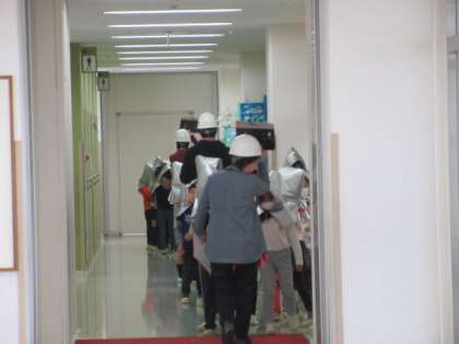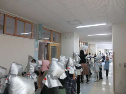 10日(火)、1時間目の終わり頃に避難訓練をしました。火災を想定して校庭に避難する予定でしたが、前日からの雨の影響により校庭の状態がよくないため、廊下までの避難としました。子どもたちは本番のつもりで防災頭巾をかぶり、訓練をしました。