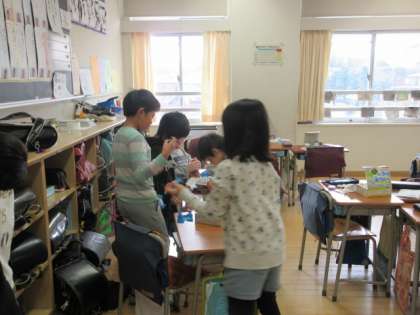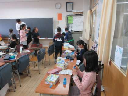 10日(火)の3・4時間目、3年5組は理科の時間でした。単元名「明かりをつけよう」の学習をしています。今回は、「電気を通すものをさがそう」をめあてに、テスターを作って、教室にあるものに当てては「光った。」「これはつかない。」と実験をしました。