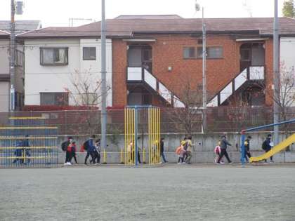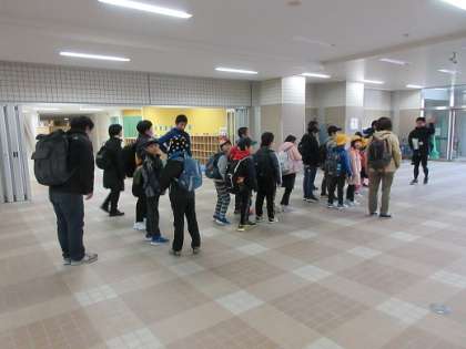 8時40分、ピロティに笑顔で集合した子どもたち。4校交流会の会場となる明正小学校へ向けて、「がんばるぞ! おー!」の気合いを入れて出発していきました。