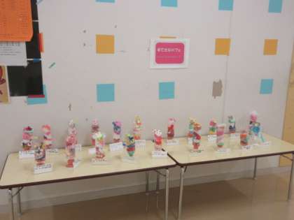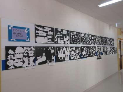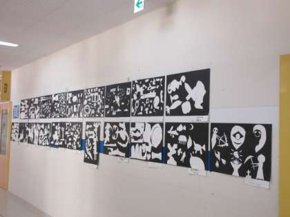 ひかり学級の廊下には、図画工作の時間に作った作品が展示されています。1つ目は「はさみアート」です。黒い画用紙に、はさみで自由に切った白紙が映えています。2つ目は、「すてきなパフェ」です。ペットボトルの中に色を付けた紙粘土をクリームやフルーツに見立てて入れています。色合いがとてもすてきです。