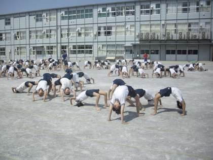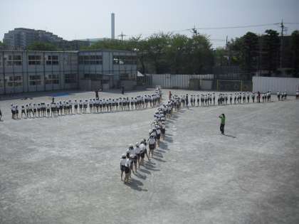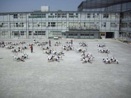 5・6年生の体育の授業の様子です。組体操に向けて、校庭で隊形の技の確認をしているところです。一人技も隊形を工夫することで見栄えも変わってきます。一人一人の力強さと集団演技の融合です。