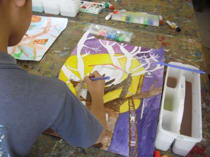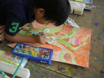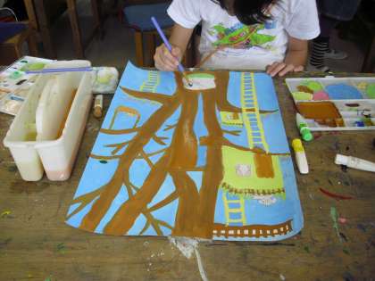 4年生の図画工作の授業の様子です。「大きな木があったら」の制作に取り組んでいるところです。作品は実物の木をデッサンするところから始めましたが、自分の想像を加えながら色を付けていくところがポイントです。