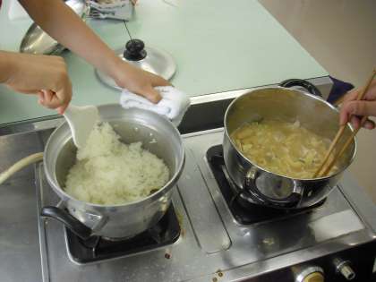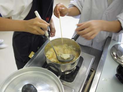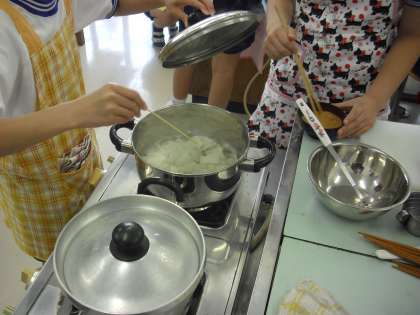 6年生の家庭科の授業の様子です。「ご飯とみそ汁」の実習に取り組んでいるところです。みそ汁はニボシからだしを取りました。具は大根、油あげ、長ネギです。子どもたちは調理実習が大好きです。