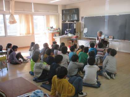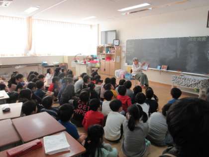 14日(土)、2年生はお話会に参加しました。今回は「たんぽぽ 〜語りと本」から2名の方にお越しいただきました。「おいしいほしがき」「びんぼうこびと」などの本や絵本を読んでいただきました。写真の上は1時間目の1組の様子、下は3時間目の4組と5組の様子です。