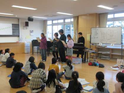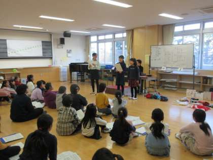 合唱団による「ウィンターコンサート」学年唱の練習風景です。写真は上から、5年生による「ジングルベル」「荒れ野のみつかい」、6年生による「もみの木」の様子です。