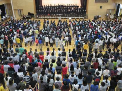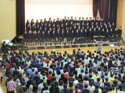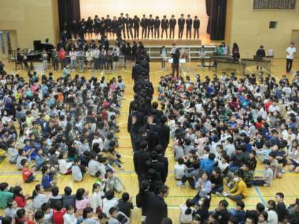 16日(月)の1時間目、小中合同朝会が小学校の体育館で行われました。小学生が全員、芦花中学校の3年生が参加しました。器楽委員が演奏する「カントリーロード」の音楽に合わせて中学生が入場しました。中学3年生が小学校の卒業式で歌った「変わらないもの」を小学生だけで、中学生だけで、そして全員で歌いました。