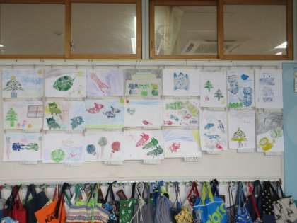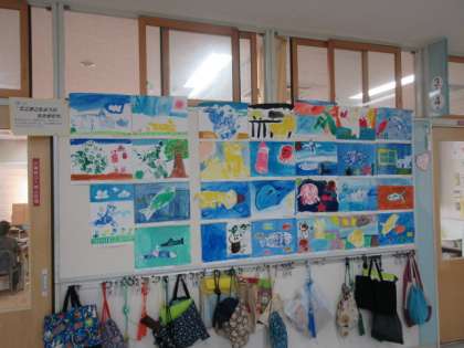 3年生の廊下には、図画工作の時間に取り組んだ作品「でこぼこもようの なかまたち」が飾られています。切った画用紙を重ね、でこぼこ模様を作りました。様々な動物が誕生しています。