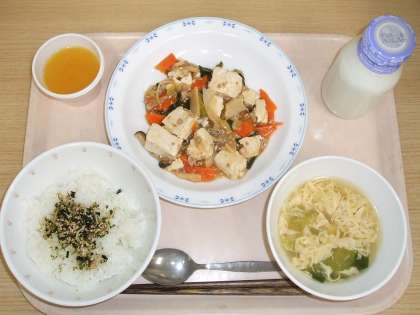 「西湖豆腐」は、麻婆豆腐と違いトマトが入った豆腐料理です。また、酢が入っているため酸味があり、さっぱりと食べられます。今日は、「手作りふりかけ」もあるため、ごはんがすすむ献立でした。