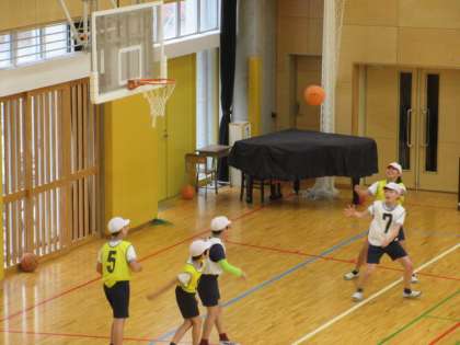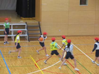 17日(火)の5時間目、6年2組は体育の時間でした。体育館で「バスケットボール」に取り組んでいました。ビブスを着けてゲームをしていました。パスをつないでシュートが決まったときの笑顔がとてもすてきでした。