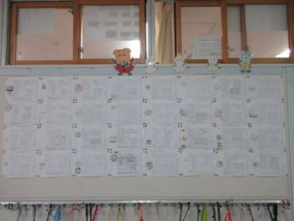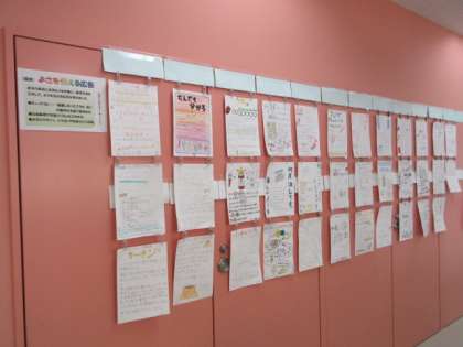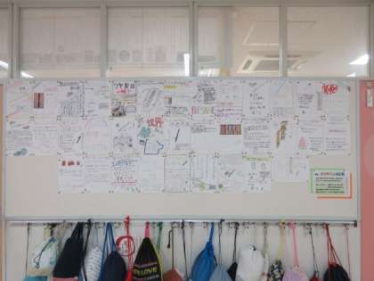 6年生の廊下には、国語の時間に取り組んだ「よさを伝える広告」が掲示されています。身の回りにある物のよさを伝えるために、キャッチコピーを考えました。また、クラスによっては、単元名「なべの国 日本」の時間に各自が調べた「日本のなべ料理」をまとめたものも掲示されています。