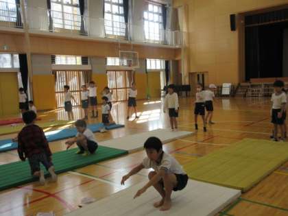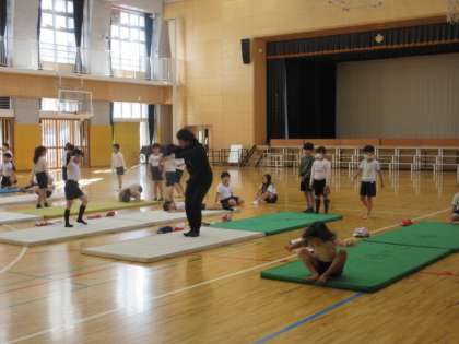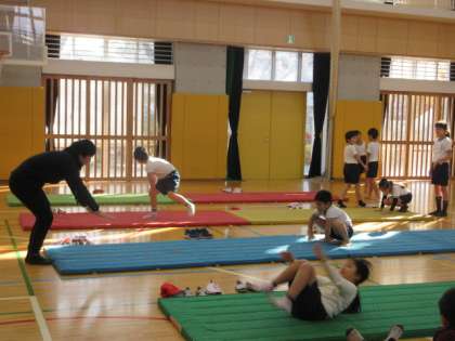 18日(水)の2時間目、3年4組は体育の時間でした。体育館で「マット運動」に取り組んでいました。8グループに分かれて、前転の練習をしました。回転後に立ち上がることが難しそうでした。