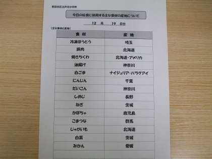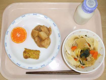 「ほうとう」と「せいだのたまじ」は、山梨県の郷土料理です。「ほうとう」といえば、平たい麺とかぼちゃです。かぼちゃの形が崩れないように、調理員さんは丁寧にかき混ぜていました。また、「せいだのたまじ」は、じゃがいもをみそで甘辛く煮詰めた料理です。今日は、麦みそを使っています。とても美味しく仕上がりました。