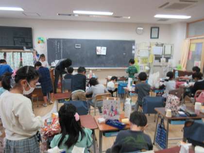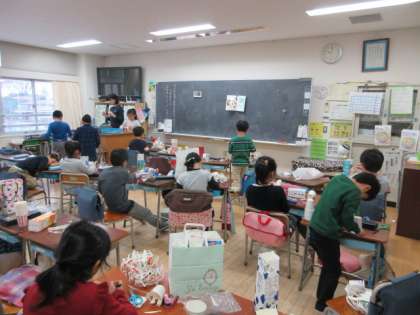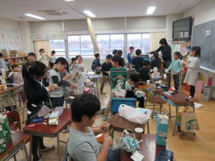 19日(木)の1・2時間目、2年5組は図画工作の時間でした。紙パックや紙コップを使った「切ってひねってつなげると」の製作に取り組んでいました。はさみで細く、長く切ってから、ひねったりつなげたりしました。複雑な形ができていて驚きました。
