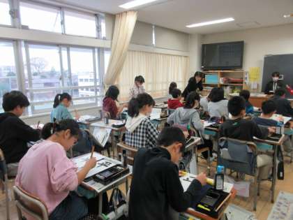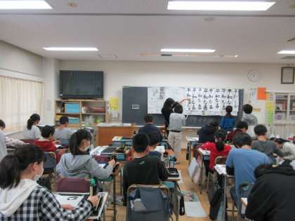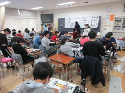 19日(木)の1・2時間目、6年3組は習字の時間でした。書き初めの練習をしました。「平和な春」の4文字を書きました。今回は10枚の内の3枚を使って練習をしました。