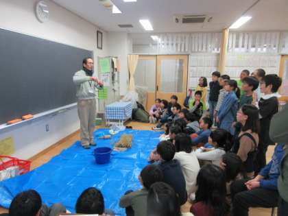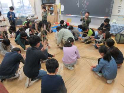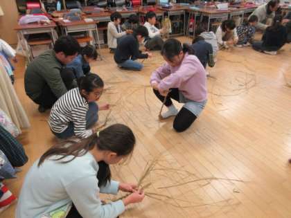 19日(木)の3時間目から6時間目にかけて、5年生は「なわない」を各学級で行いました。講師は、米作りでご指導をいただいている方です。最初にお手本を見せていただきました。あっという間に完成した上に、引っ張っても切れないし、水の入ったバケツを持ち上げる強さがあり、子どもたちは驚いていました。その後、一人10本ずつわらを手にして、なわをないました。実際にやってみるとその難しさに気付きました。写真は、3時間目の2組の様子です。