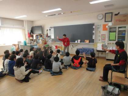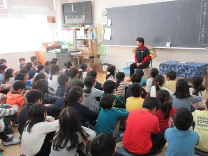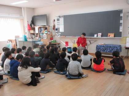 20日(金)、3年生はお話会に参加しました。今回も「たんぽぽ 〜語りと本」から2名の方にお越しいただきました。外国のお話があったり、手遊び歌があったりして楽しく過ごしました。写真は、1組、3組と5組の様子です。