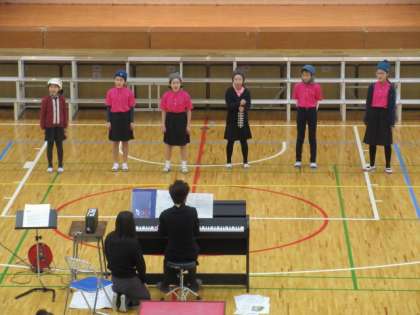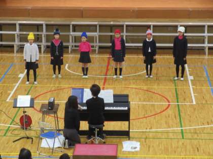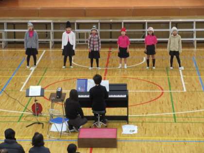 ウィンターコンサートは体育館での開催でした。暖房がないため、上着を着るなどの対策をして実施しました。写真は、4年生の学年唱「よろこびの歌」「きよしこの夜」、5年生の学年唱「ジングルベル」です。