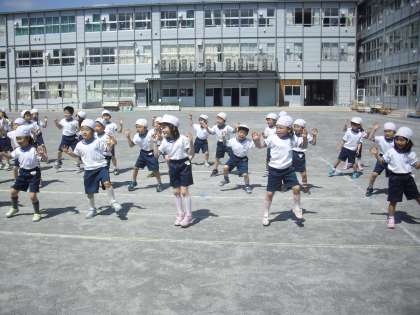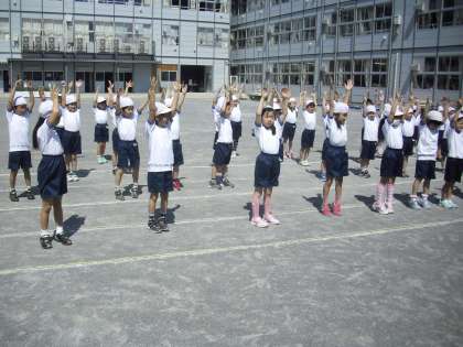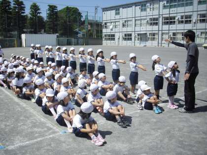 1年生の体育の授業の様子です。前へならえをして整列しているところです。見てください。ピンとの伸びた腕と指先。体育座りをしている子どもたちも真っ直ぐです。運動会に向けての表現ダンスもがんばっていました。