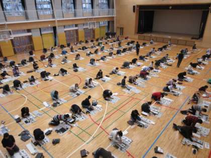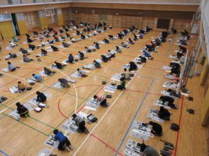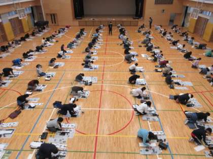 8日(水)の3・4時間目、6年生は校内のトップをきって書き初めの「席書会」を行いました。始業式後、体育着に着替えて計測を行い、また、着替えて書き初めに臨みました。最上級生としててきぱきとした姿がありました。席書会は各クラス2列に並び、箏の調べをBGMに静かに行われました。