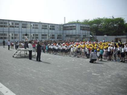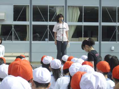 看護当番から今週の生活目標についての話をしているところです。今週の目標は「あいさつも、返事も元気に気持ちよく」です。授業や生活の中でもしっかりと返事ができるように指導していきます。