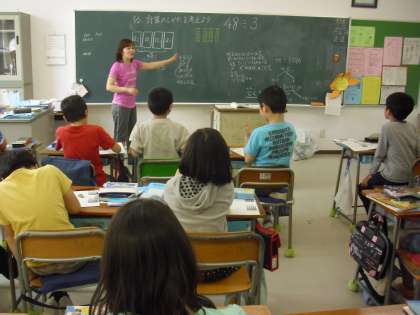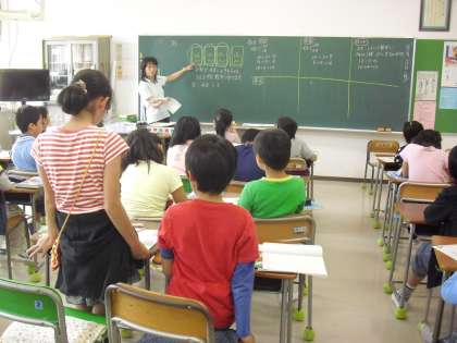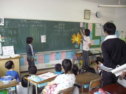 4年生の算数少人数指導の授業の様子です。わり算の計算のについて学習しているところです。自分の計算の仕方の考え方を発表したり、黒板に解き方を書いたりしながらわり算の計算の仕方について共通理解を図っています。