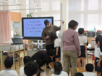 9日(木)の1時間目、ひかり学級は保健室で計測を行いました。最初に、養護教諭から「ねむることの大切さ」についての話がありました。夜9時までに眠ると体にも心にもよいことがたくさんあるとわかりました。その後、1年生から順番に身長、体重の順で計測をしました。廊下に脱いだ上履きがきちんとそろえてあり、立派でした。