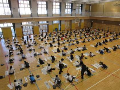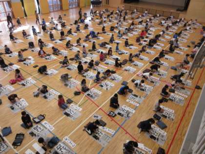 10日(金)の1・2時間目、3年生は初めての席書会に臨みました。習字道具等を体育館に運び、クラスごとに並んで準備を始めました。一文字ずつ練習をしてから、清書をしました。片付けまでしっかり行うことができました。