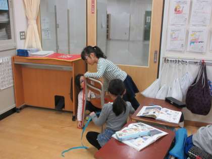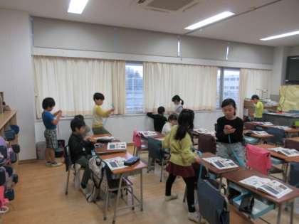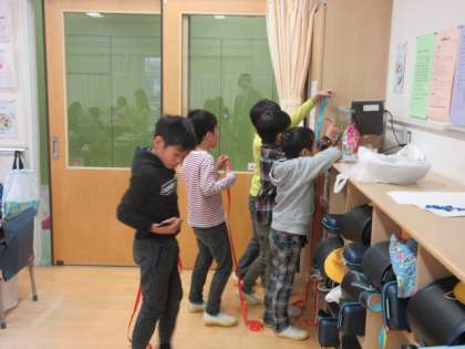 15日(水)の2時間目、1年4組は算数の時間でした。各自紙テープを持って、教室内のものの大きさを測っていました。いすや水槽、机の横幅や筆箱など、自分で興味をもったものの大きさを調べていました。