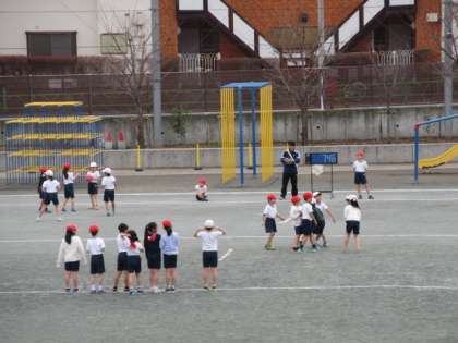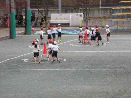 16日(木)の5時間目、3年1組は体育の時間でした。校庭でボール運動に取り組んでいました。帽子の色でチームを分け、時間を決めてゲームをしました。