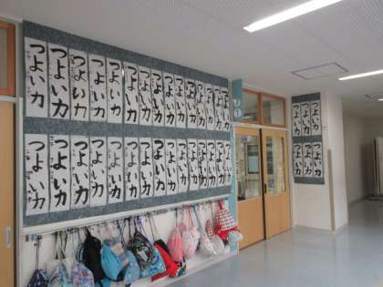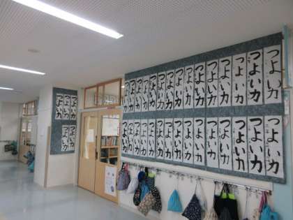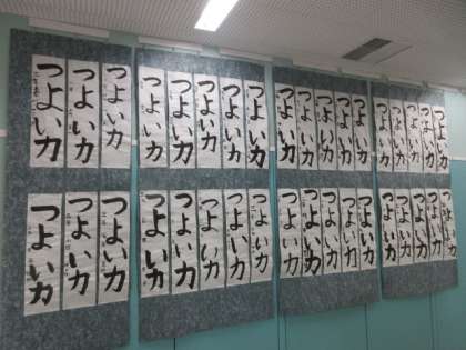 3年生にとって初めての毛筆による書き初め展です。「つよい力」の4文字をバランスよく書き上げました。。