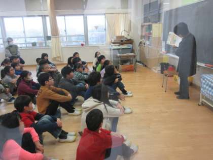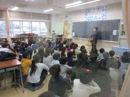 18日(土)、4年生はお話会がありました。今回も読み聞かせグループ「たんぽぽ 〜語りと本」から2名の方にお越しいただきました。写真は、1組と5組の合同の様子、3組の様子です。
