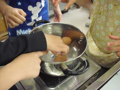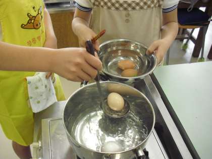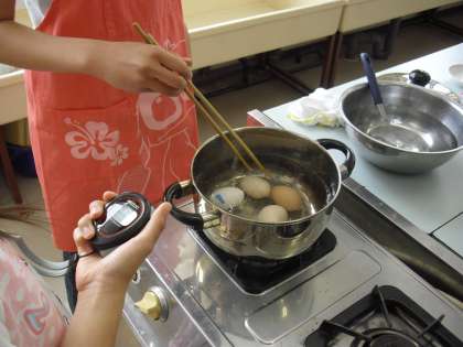 5年生の家庭科の授業の様子です。調理実習でゆでたまごを作っているところです。水に卵を入れ、火にかけ、時間を計りながら時々お湯をかき混ぜていきます。時間になったら卵を取り出し、水の入ったボールに移します。