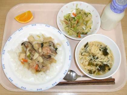今日はいろいろな具材が入った「中華丼」です。給食室での下処理はひと苦労でしたが、豚肉や魚介、野菜、きのこなどを使うことで、うま味もたっぷり詰まっていました。