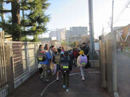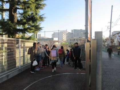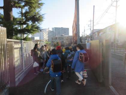 21日(火)朝の登校風景です。保護者・地域の皆様によるあいさつキャンペーンは終わりましたが、1月担当の6年生は当番を決めて南門に立ち続けています。6年生が向かい合って作る道の真ん中を子どもたちがタッチをしながら進んでいきます。