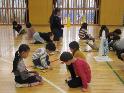 23日(木)に1年生と遊ぶため、2年生はずっと練習をしてきました。昨年度は遊び方を教えてもらう側でしたが、今回は違います。やり方を丁寧に教えてあげる姿があり、成長を感じました。写真は上から、おはじき、お手玉の様子です。