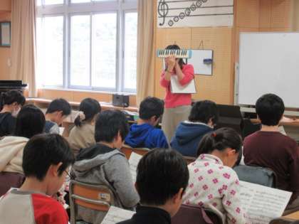 24日(金)の3時間目、6年3組は音楽の時間でした。合奏曲「コナン」の鍵盤ハーモニカパートを全員で練習していました。指の切り替えをさらいながら、伴奏用CDに合わせて演奏できるようになってきました。