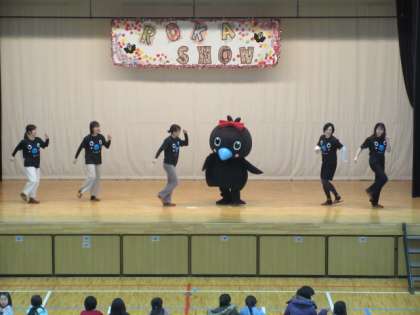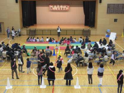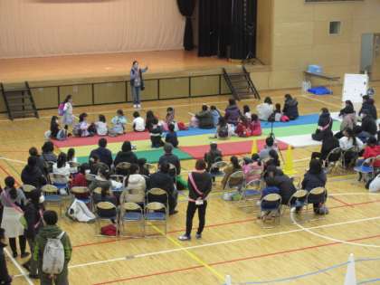 26日(日)、PTAイベント委員会主催「新年親子お楽しみ会」が午前10時から開催されました。午前8時の時点で雨が降っていたため、雨バージョンで実施しました。開会式は、からぴょんのダンスから始まりました。日本女子体育大学の皆さんも踊ってくださいました。その後、校長先生による開会宣言、イベント委員会委員長の挨拶がありました。