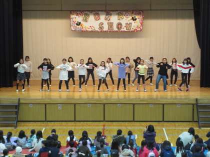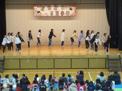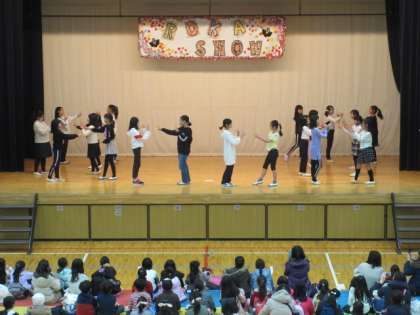 新年親子お楽しみ会は、ステージ部門、遊びコーナー、食べ物コーナーを同時に展開しています。ステージでは、本校のダンスクラブによる発表をしました。クラブ活動の時間に練習をしてきた中から2曲を披露しました。