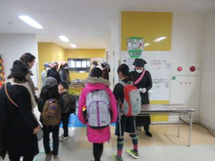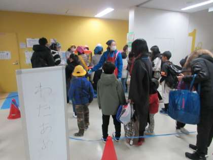 新年親子お楽しみ会の食べ物コーナーの紹介です。本校は指定避難所であることを踏まえ、メニューや提供方法についても安全な炊き出し提供を意識して実施しました。写真は、PTAバレーボール部による「わたあめ」、PTA本部による「ポップコーン」の様子です。