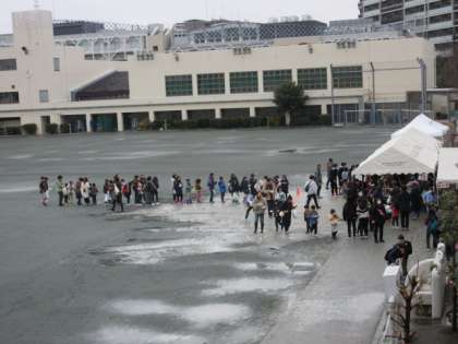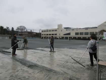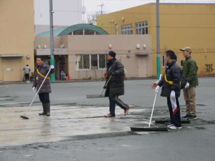 新年親子お楽しみ会における食事提供を行うために、保護者・地域の方が、炊き出しをしているテント近くの水たまりをきれいに掃いてくださいました。そのお陰でカレーや豚汁が受け取りやすくなりました。細やかなお心配りに感謝いたします。