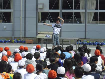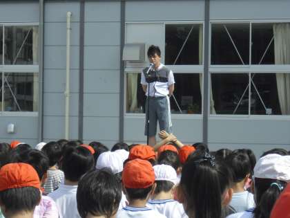 看護当番の八巻先生が今週の生活目標「練習も力いっぱい楽しもう」について話しているところです。実際にダンスの実演を取り入れながら、目標の意味を子どもたちに分かりやすく伝えていました。