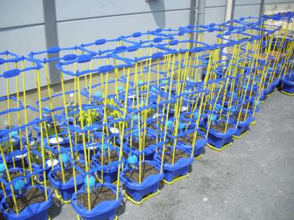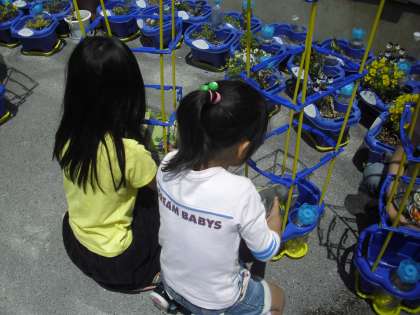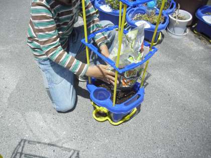 1年生の生活科の授業の様子です。アサガオの種を植える鉢に土を入れているところです。こぼさないように、ゆっくりとていねいに入れました。そこに種を5つ蒔きました。