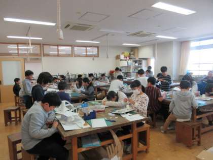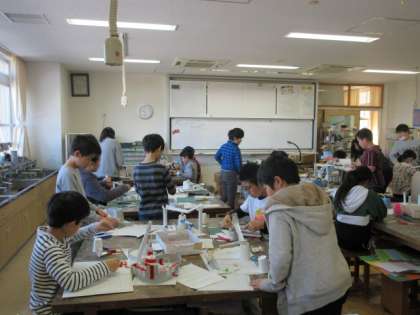 29日(水)の1・2時間目、5年3組は図画工作の時間でした。工作「ビー玉転がし」の最終回でした。工作用紙やわり箸を使いながら、自由な発想でビー玉の道を作っていました。