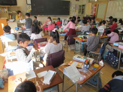 31日(金)の1・2時間目、1年2組は図画工作の時間でした。「ゆめのまち さんちょうめ」と題して、各自が持って来た箱や割り箸、モールなどを使いながら「家」を作りました。エレベーターがあったり、屋上にサッカー場があったりしてわくわくする家がたくさんできました。