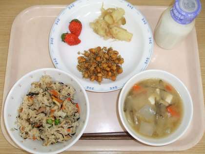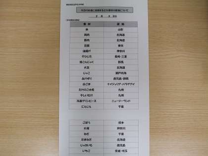 今日は節分ということで、福豆(いり大豆)の代わりに「大豆とじゃこの甘辛揚げ」を作りました。しょうゆと砂糖の甘辛い味付けなので、豆類や小魚が苦手な児童にも、食べやすく人気の料理です。今年一年間、みなさんのところに、たくさんの「福」が来ますように!