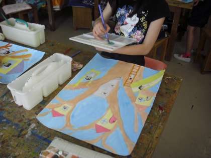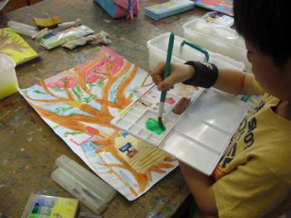 4年生の図画工作の授業の様子です。「大きな木があったら」の制作に取り組んでいるところです。パレットに置いた絵の具を水で溶きながら、画用紙に筆で色を塗っています。用具の使い方も上手です。