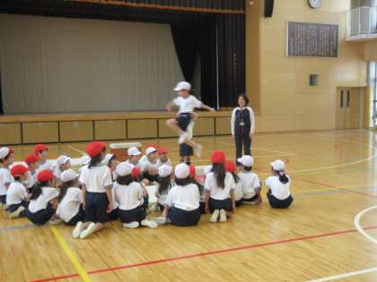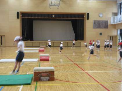 4日(火)の3時間目、1年3組は体育の時間でした。体育館で「跳び箱あそび」をしていました。助走から跳び箱を踏み切り、高くジャンプをして着地するという遊びです。先生の話を聞いたり、友達の跳び方を見たりしながら練習をしていました。