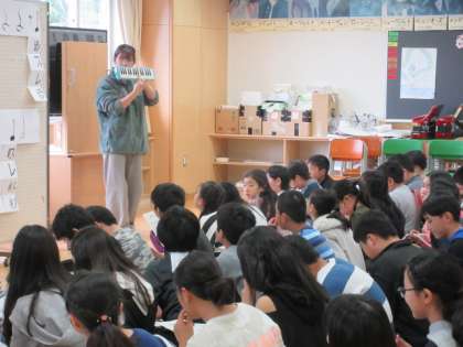4日(火)の5時間目、6年1組と4組は合同で音楽の時間でした。第一音楽室で歌「大切なもの」と合奏曲「コナン」の練習をしていました。合奏曲では、リズム打ちをみんなで練習してから鍵盤ハーモニカで実践しました。