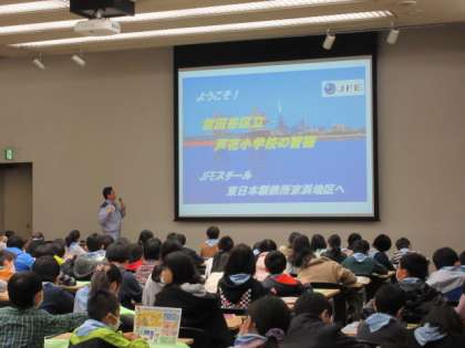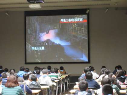 午後は、川崎にあるJFEスチールの東日本製鉄所に行きました。アメニティホールで見学コースについてレクチャーを受けた後、所内をバスと、一部徒歩で巡りました。厚板圧延という工程で、出来上がった鉄の板を平たく伸ばす様子は大迫力で、皆、只々立ち尽くすばかり。3大原料の鉄鉱石、コークス、石灰石の比重の違いを、手で感じることもできました。
