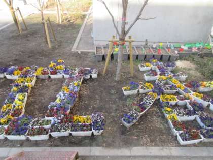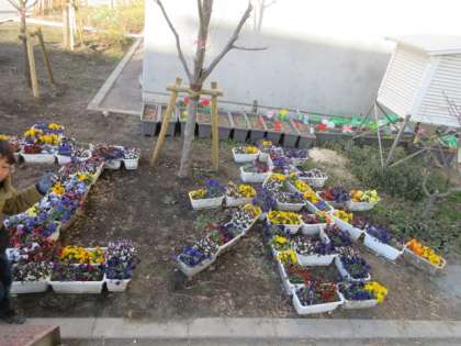 栽培委員会が世話をしているパンジーを植えたプランターの配置が変わりました。3日(月)の活動時に話し合って、「立春」にしました。さらに左側にはハートの形も作り、登校してきた子どもたちを迎えています。職員室前の花壇には「ふきのとう」も顔を出し始めました。